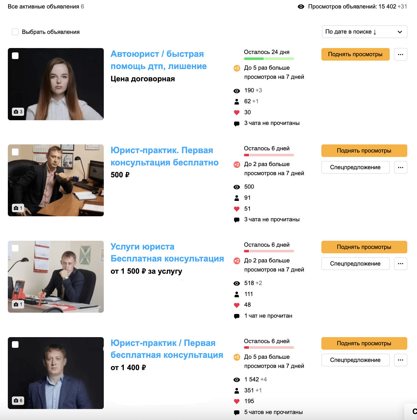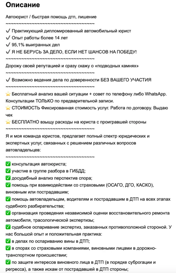 Также, в каждом объявлении делался акцент на различные виды юридических услуг, чтобы охватить максимум поисковых запросов.