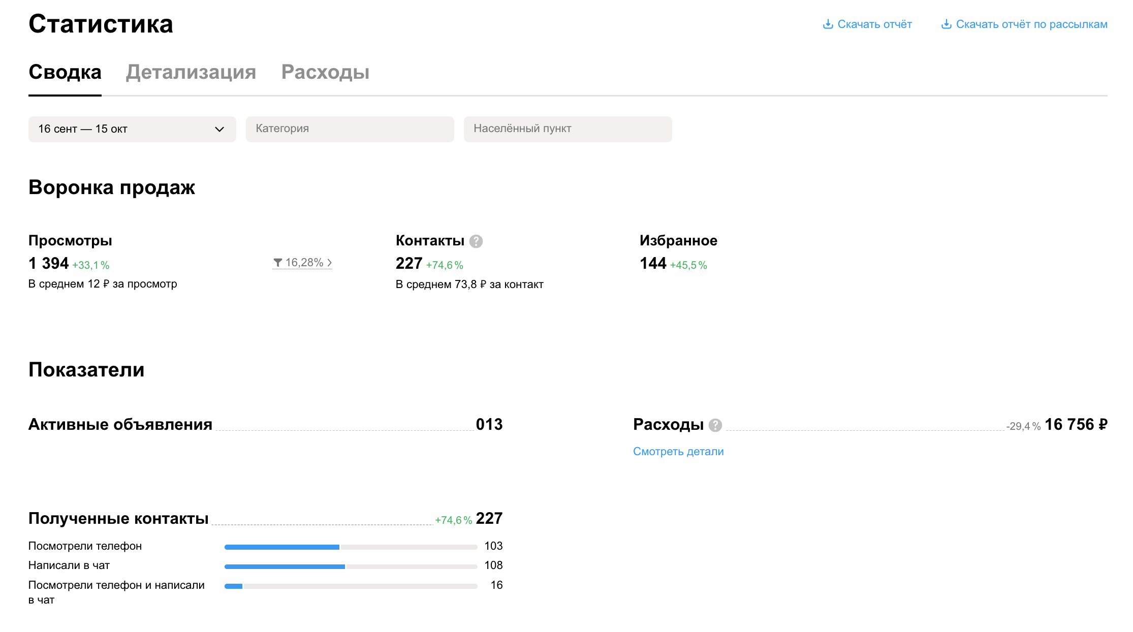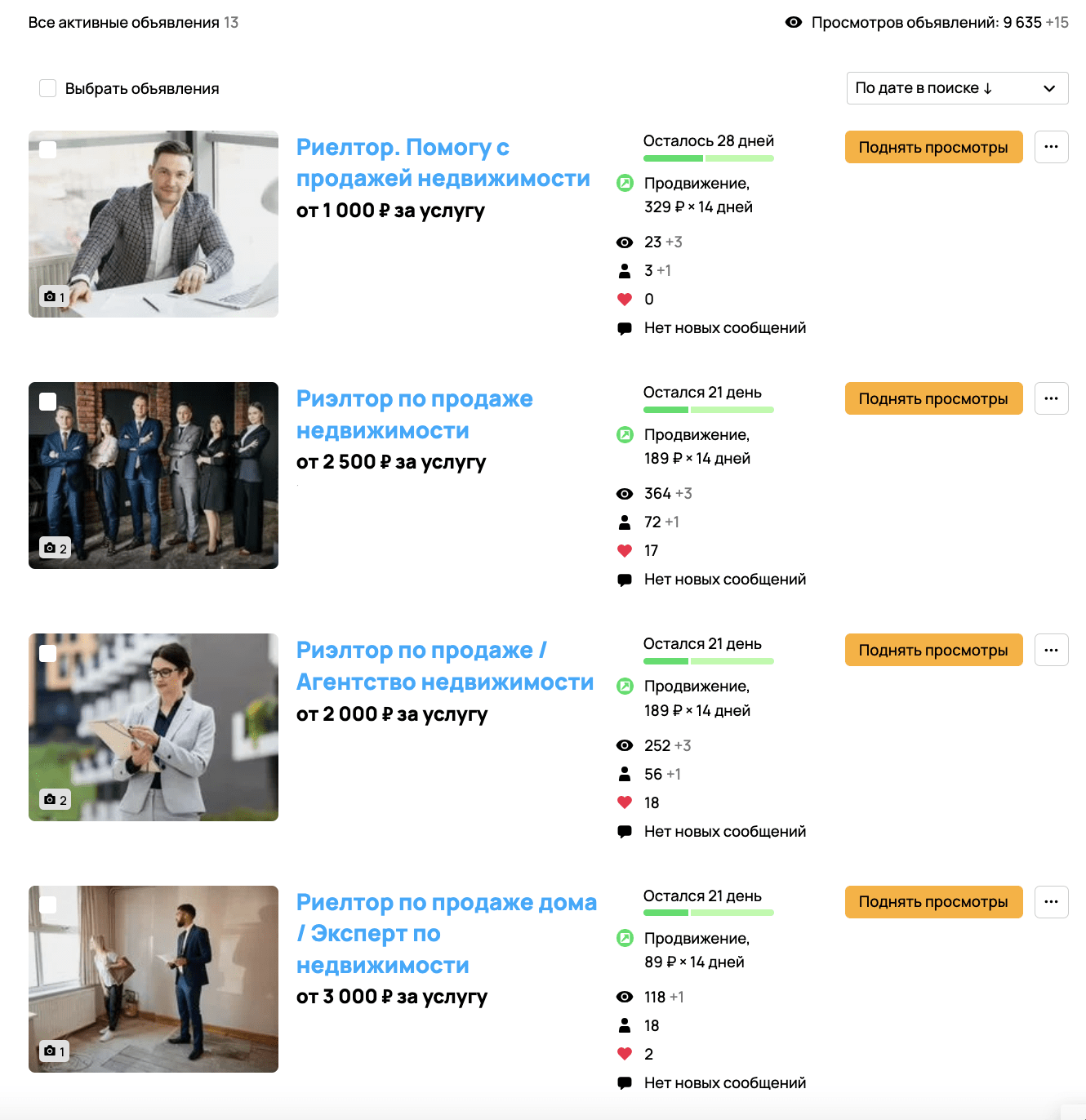 1. Высокая конкуренция в нише по целевой локации, в условиях которой большое количество объявлений поднималось в выдаче за счет дополнительных услуг (от х10 до х20);